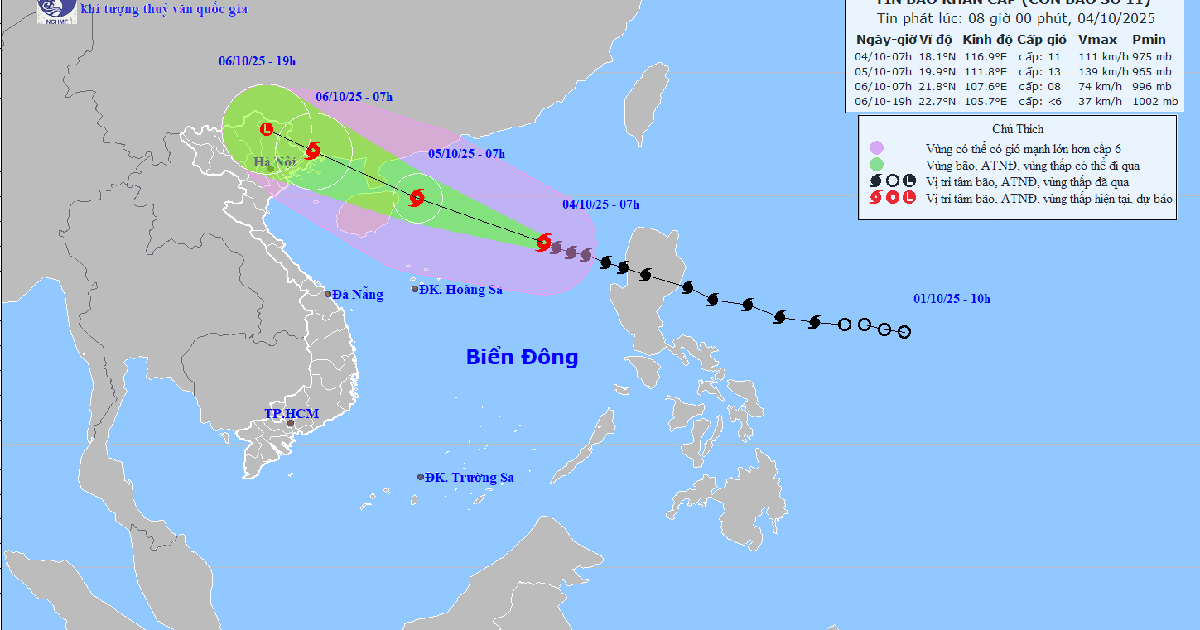 Theo dự báo của Trung tâm Dự báo khí tượng thủy văn quốc gia, bão số 11 sẽ tiếp tục mạnh lên, đạt cấp 12 – 13, giật cấp 15 – 16, di chuyển nhanh về phía bán đảo Lôi Châu (Trung Quốc) và khu vực vịnh Bắc bộ. Trong các ngày 5 đến 7.10, bão sẽ ảnh hưởng trực tiếp tới vịnh Bắc Bộ, ven biển và đất liền, gây ra mưa lớn tại các tỉnh Bắc Bộ, Thanh Hóa và Nghệ An.
