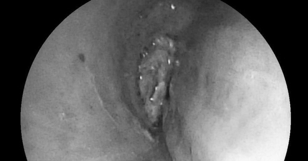 Hình ảnh nội soi cho thấy rõ dị vật góc cạnh, nằm chắn ngang lòng phế quản, gây tắc nghẽn nghiêm trọng, đe dọa tính mạng người bệnh nếu không được xử lý kịp thời. Sau quá trình can thiệp, bệnh nhân ổn định, thở dễ dàng, các triệu chứng tức ngực biến mất, và người bệnh đã được xuất viện sau 24 giờ theo dõi sát sao.