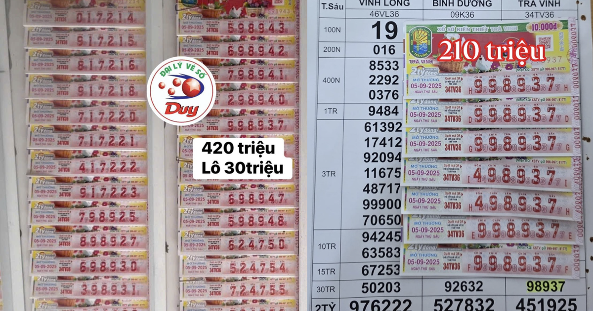 Trong chiều nay, thị trường xổ số miền Nam trở nên sôi động hơn bao giờ hết khi có nhiều thông tin về các khách hàng trúng thưởng ‘khủng’ sau kỳ quay mở thưởng ngày 5 tháng 9. Đặc biệt, tại Vĩnh Long, chủ đại lý vé số Duy đã chính thức xác nhận việc bán trúng 14 tờ giải nhất trị giá mỗi tờ 30 triệu đồng, chưa trừ thuế. Khách hàng đã đến tận quầy để mua các tờ vé có dãy số 98937 của đài Trà Vinh và nhận thưởng chiều nay. Trong đó, giải độc đắc của đài Trà Vinh đã thuộc về các tờ vé số có dãy số 451925.