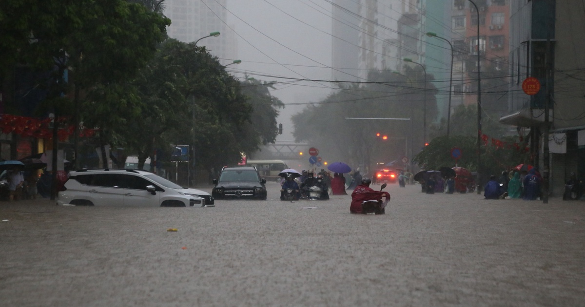 Mưa lớn đã tạo ra ít nhất 82 điểm úng ngập trên toàn thành phố, tăng 17 điểm so với sáng cùng ngày. Các tuyến đường chính như Trần Duy Hưng, Liễu Giai đều chật cứng phương tiện, ô tô chết máy hàng loạt, chôn chân dưới dòng nước. Trên đường Khuất Duy Tiến hướng đến Nguyễn Trãi, dòng phương tiện phải dắt bộ hoặc di chuyển chậm chạp qua các điểm ngập sâu.